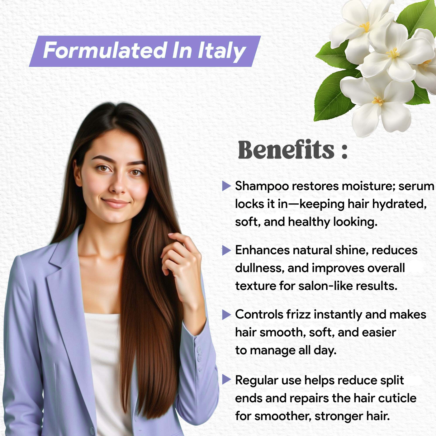 Enriched with Sea Buckthorn Oil, Hibiscus, Jasmine, Sunflower Oil, Murumuru Butter, and Plant Keratin Protein, the shampoo gently cleanses the scalp while strengthening weak strands, and the serum deeply nourishes, smoothens frizz, and protects hair from daily damage and heat styling.