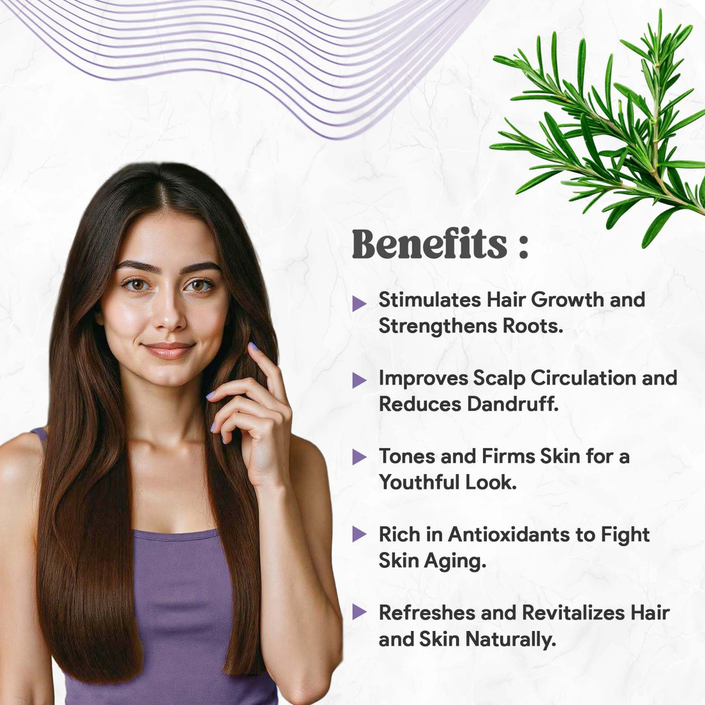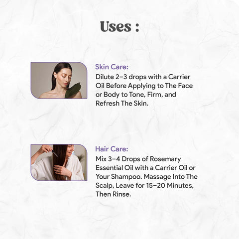 For Skin, It Tones, Firms, and Refreshes While Helping Reduce Signs of Premature Aging. Its Antioxidant-Rich Composition Protects Against Environmental Damage, Leaving Hair Strong and Skin Radiant. When Diluted with a Carrier Oil, It Works Perfectly for Scalp Massages, Hair Treatments, and Skincare Blends. Make Rosemary Essential Oil a Part of Your Beauty Routine and Experience Nature’s Touch for Healthy Hair and Glowing Skin.