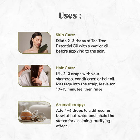 In Hair Care, It Reduces Dandruff, Refreshes The Scalp, and Supports Strong, Healthy Growth. Its Refreshing Herbal Aroma Also Promotes Relaxation and Mental Clarity During Aromatherapy. Whether Blended with a Carrier Oil for Massage, Added to Your Skincare Routine, or Infused into Your Shampoo, Tea Tree Essential Oil Delivers Nature’s Pure Benefits for Your Everyday Wellness and Beauty.