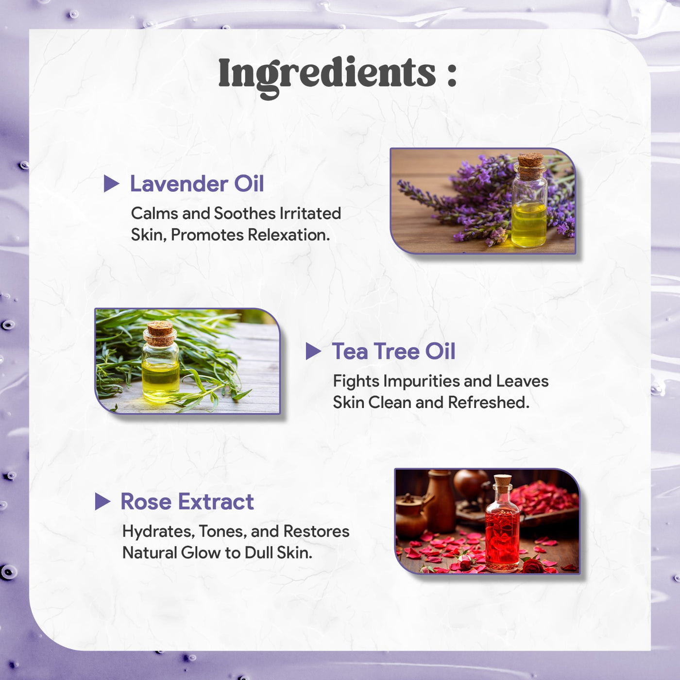 Infused with Lavender Oil, Tea Tree Oil, and Rose Extract for a Soothing Experience.